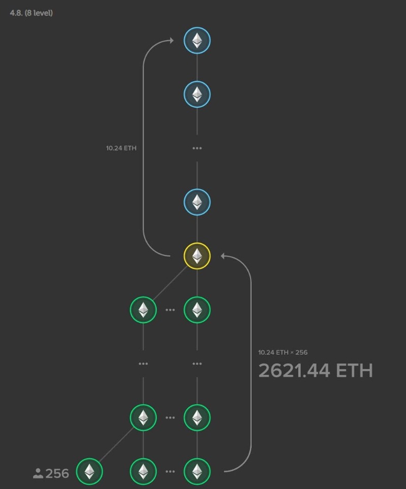 در مرحله بعد شما باید 0.16 اتر وارد کنید تا به دو نفر بالا سری خودتان برسد و زیرمجموعه‌های بیشتری بگیرید تا این بار هم با پول زیرمجموعه‌های جدیدتان 0.32 اتر کسب کنید! شما تصور می‌کنید که پولتان را افزایش داده‌اید و پول بالاسری‌های شما هم با سرعت بیشتری درحال افزایش است. شما مدام لول آپ می‌کنید (از سطح یک شروع می‌کنید تا درنهایت به سطح 8 برسید)، به مرحله بالاتری می‌روید و افراد جدید بیشتری را وارد می‌کنید.