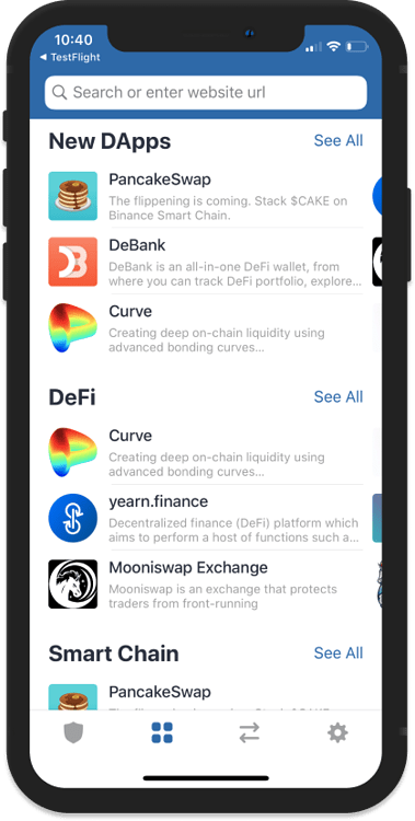 در این قسمت قرار است به عنوان نمونه از کیف پول تراست والت استفاده کنیم. ابتدا اطمینان یابید که در حال استفاده از آخرین نسخه کیف پول تراست هستید. از کیف پول تراست خود و با استفاده از قسمت مربوط اپلیکیشن‌های غیرمتمرکز (DApps)، گزینه PancakeSwap را انتخاب کنید. همچنین می‌توانید برای این کار به وبسایت رسمی این پلتفرم معاملاتی به آدرس exchange.pancakeswap  مراجعه نمایید.