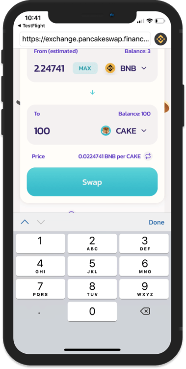 سپس توکن کیک را انتخاب کنید و بعد از آن، نوع توکن و مقداری که قصد تبادل آنها را دارید، وارد نمایید. در صورتی که تمامی اطلاعات مورد تأیید شما بود، گزینه Swap را انتخاب کنید.