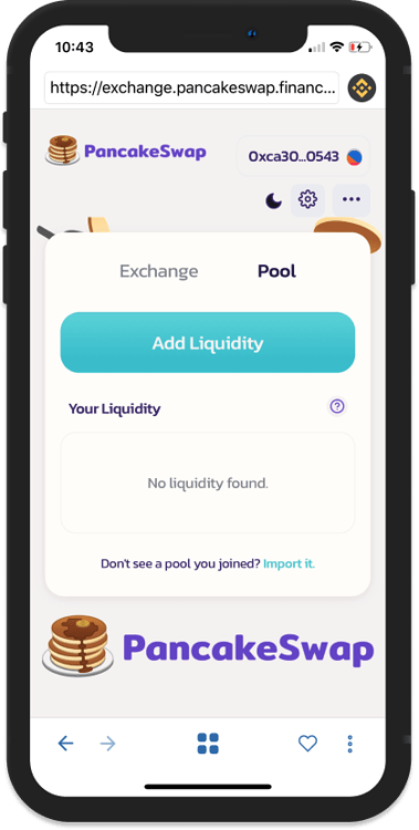 با استفاده از گزینۀ pool می‌توانید به اضافه کردن نقدینگی به پلتفرم ارز دیجیتال پنکیک سواپ بپردازید. برای ادامه فرآیند گزینۀ Add Liquidity را انتخاب نمایید.