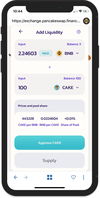سپس توکن Cake را انتخاب کنید و مقدار مورد نظر خود را برای واریز وارد کنید. سپس گزینه Approve Cake را انتخاب کنید تا تراکنش شما انجام شود.