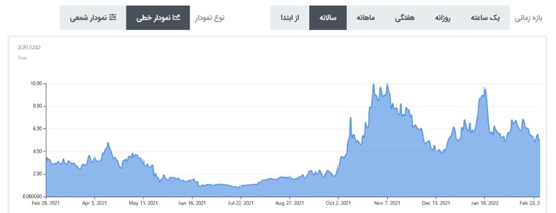 البته این سطح مدت زیادی حفظ نشد و روز بعد سقوط قیمت آغاز شد و حتی کف 2.4 دلار را نیز ثبت کرد. موج صعودی بعدی این بار در اوایل آوریل آغاز گردید ولی قیمت SCRT نتوانست از 4.7 دلار فراتر برود. بعد از عدم موفقیت گاوها در ثبت قله جدید، روند نزولی این توکن شروع شد و در جولای 2021 به سطوح زیر 1 دلار هم رسید.
