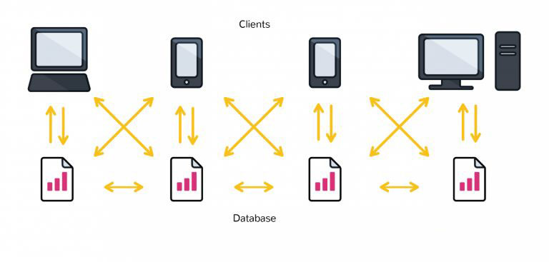 در بلاک‌چین، اعضایی که هیچ اعتمادی به هم ندارند، بدون حضور و نیاز به مدیریت مرکزی قادر هستند تا به اشتراک‌گذاری اطلاعات بپردازند. در این ساختار، تراکنش‌ها توسط شبکه‌ای از کاربران و بر اساس مکانیزم اجماع، پردازش می‌شوند که در نهایت به صورت همزمان یک سیستم مشابه و مشترکی از رکوردهای پایگاه داده به وجود می‌آید.