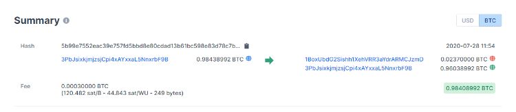 در تصویر بالا سمت راست تصویر گزینه BTC و USD وجود دارد که چنانچه این گزینه را بزنید، مقدار بیت کوین با احتساب قیمت بیت کوین به دلار، در واحد دلار نمایش داده میشود. در این حالت اعداد ملموستر است و میتوانید سادهتر کار رهگیری را انجام دهید. همچنین میتوانید با مطالعه مقاله رهگیری تراکنش بیت کوین با استفاده از کوین مارکت کپ با برخی دیگر از این پارامترهای تراکنش آشنا شوید.