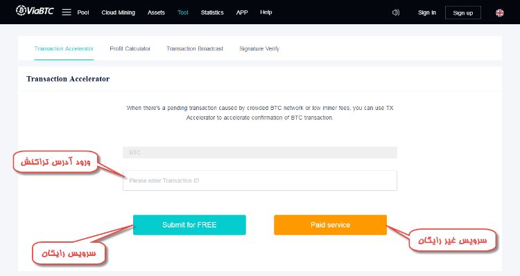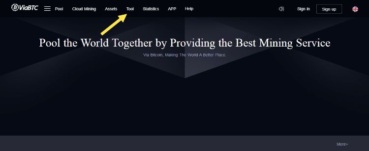 برای افزایش سرعت تراکنشهای خود وارد سایت viabtc.com شوید و از منو بالا گزینه Tool را انتخاب کنید.